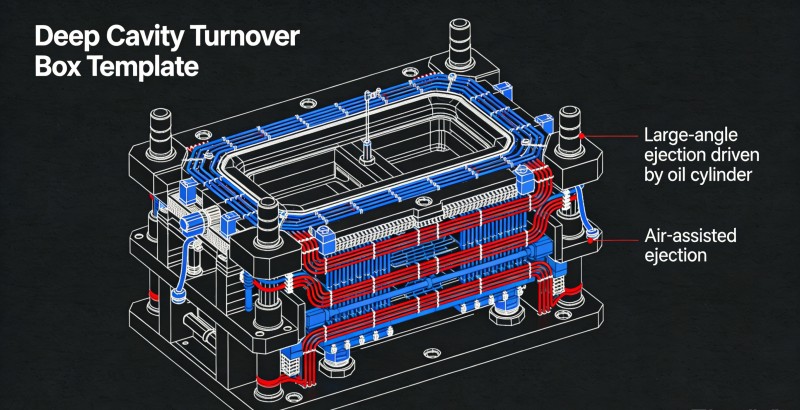 Défi : Les volumes importants et les parois épaisses des conteneurs logistiques entraînent des temps de refroidissement prolongés, limitant ainsi la capacité de production. Solution : Concevoir des canaux de refroidissement série multicouches à grande vitesse couvrant de manière dense toutes les zones à parois épaisses. Pour les conteneurs à cavité profonde, combinez des « éjecteurs inclinés à grand angle entraînés par un vérin hydraulique » avec une « éjection assistée par gaz » pour garantir un démoulage fluide et rapide en un minimum de temps sans déformation ni adhérence sous vide, minimisant ainsi les cycles de production.