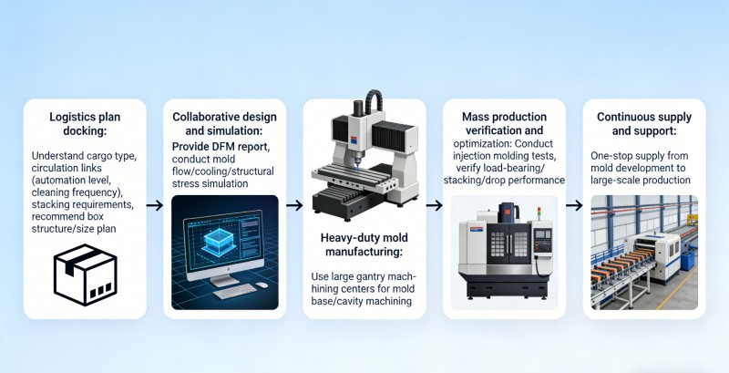 1. Alignement de la solution logistique : comprenez votre type de cargaison, les étapes de manutention (par exemple, le niveau d'automatisation, la fréquence de nettoyage) et les exigences d'empilage pour recommander des solutions optimales en matière de structure et de taille de conteneur. 2. Conception et simulation collaboratives : fournissez des rapports DFM complets et effectuez des simulations de flux de moule, de refroidissement et de contraintes structurelles pour garantir des solutions de moule optimales en termes de performances et de coûts. 3. Fabrication de moules robustes : utilisez de grands centres d'usinage à portique pour garantir la précision et la rigidité dans l'usinage de grandes bases de moules et cavités. 4. Validation et optimisation de la production de masse : effectuez des tests de production continus sur les machines de moulage par injection pour valider les mesures de performance critiques (tests de portance, d'empilage, de chute) et finaliser les processus. 5. Approvisionnement et support continus : Nous proposons un approvisionnement unique, du développement de moules à la production de moulage par injection à grande échelle, garantissant une qualité de produit constante et une livraison rapide.